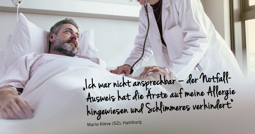 • Der Notfallausweis enthält lebenswichtige Informationen, wie Medikamentenplan, Allergien und Kontaktdaten Ihrer wichtigsten Ansprechpartner. Können Sie sich vorstellen, wie hilfreich es wäre, alle wichtigen medizinischen Informationen in einem Notfallausweis zu haben? Zum Beispiel, wenn ein Rettungsdienst schnell reagieren muss.